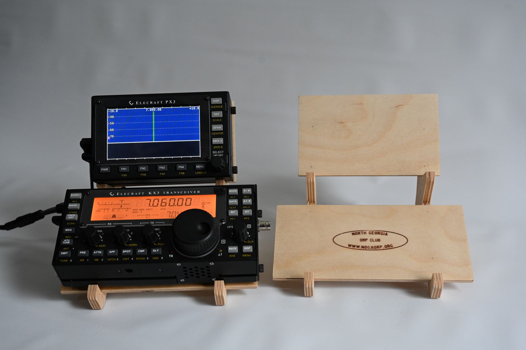 NoGaStand "KX3-PX3 Combo" Please contact me directly by email before placing any stand order. At this time and for the foreseeable future the Baltic birch plywood. an imported product not produced in the USA, is used for the construction all the stands, is no longer available and a suitable alternative has not been found. I still have a few stands in stock but none for some of the models, so prior to placing any order please contact me to confirm availability. Paul Kelley, W4KLY w4kly@bellsouth.net |